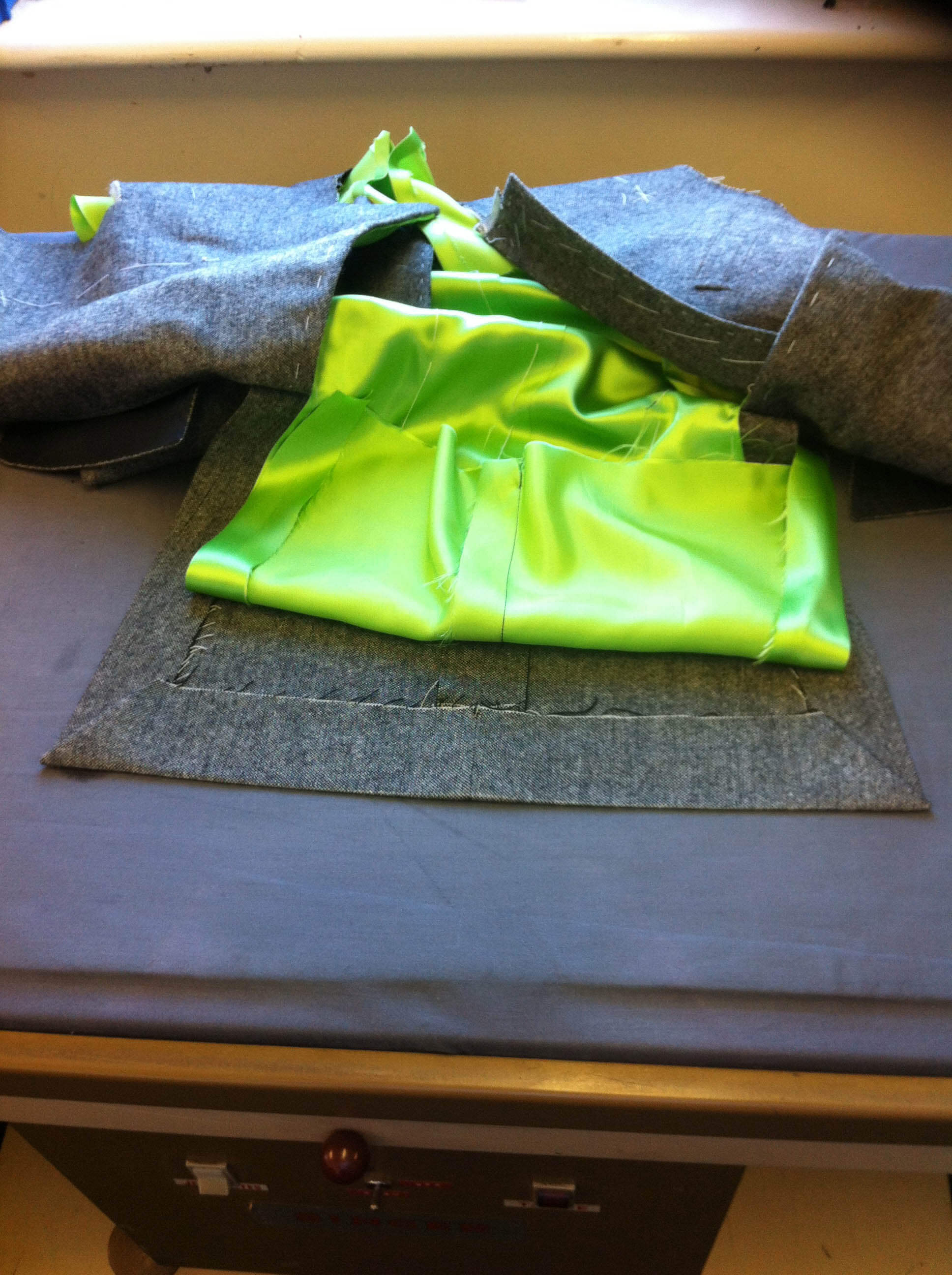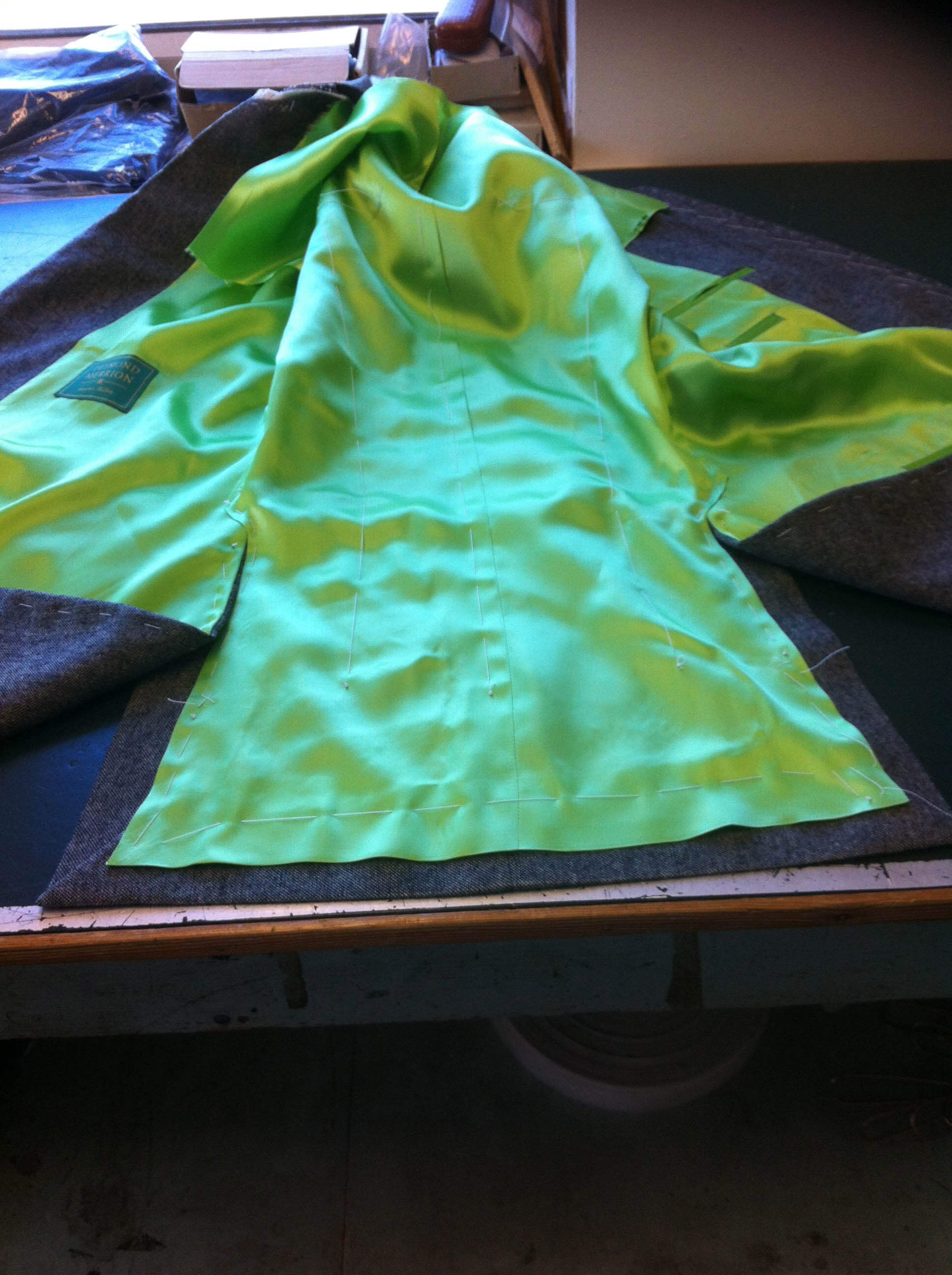 The picture to the left shows the same coat with the lining hem now also hand basted, ( tacked ) into place ready for the hand finishing to be done.