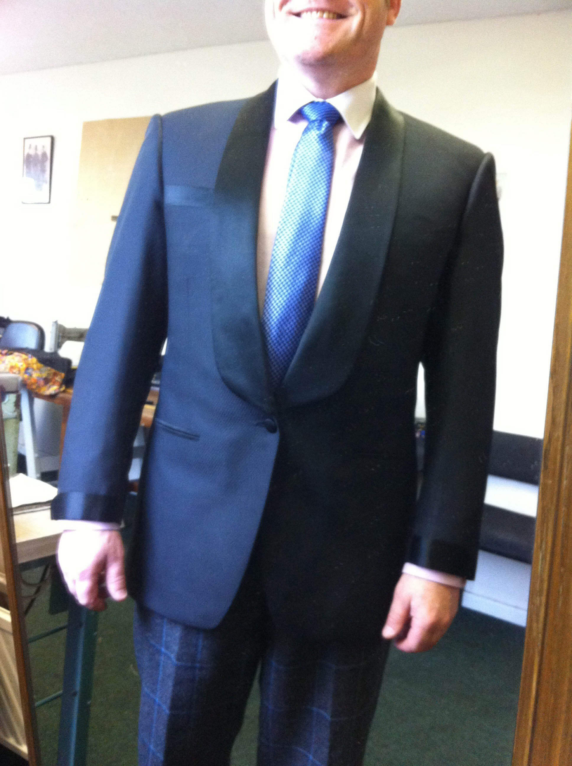 Anyway, here are a few pictures of ugly old me wearing the coat at work last week. Before anyone chelps up, yes, yes, I won’t be wearing those checked trousers or that particular tie with the suit, I was at work simply trying the coat on for fit !