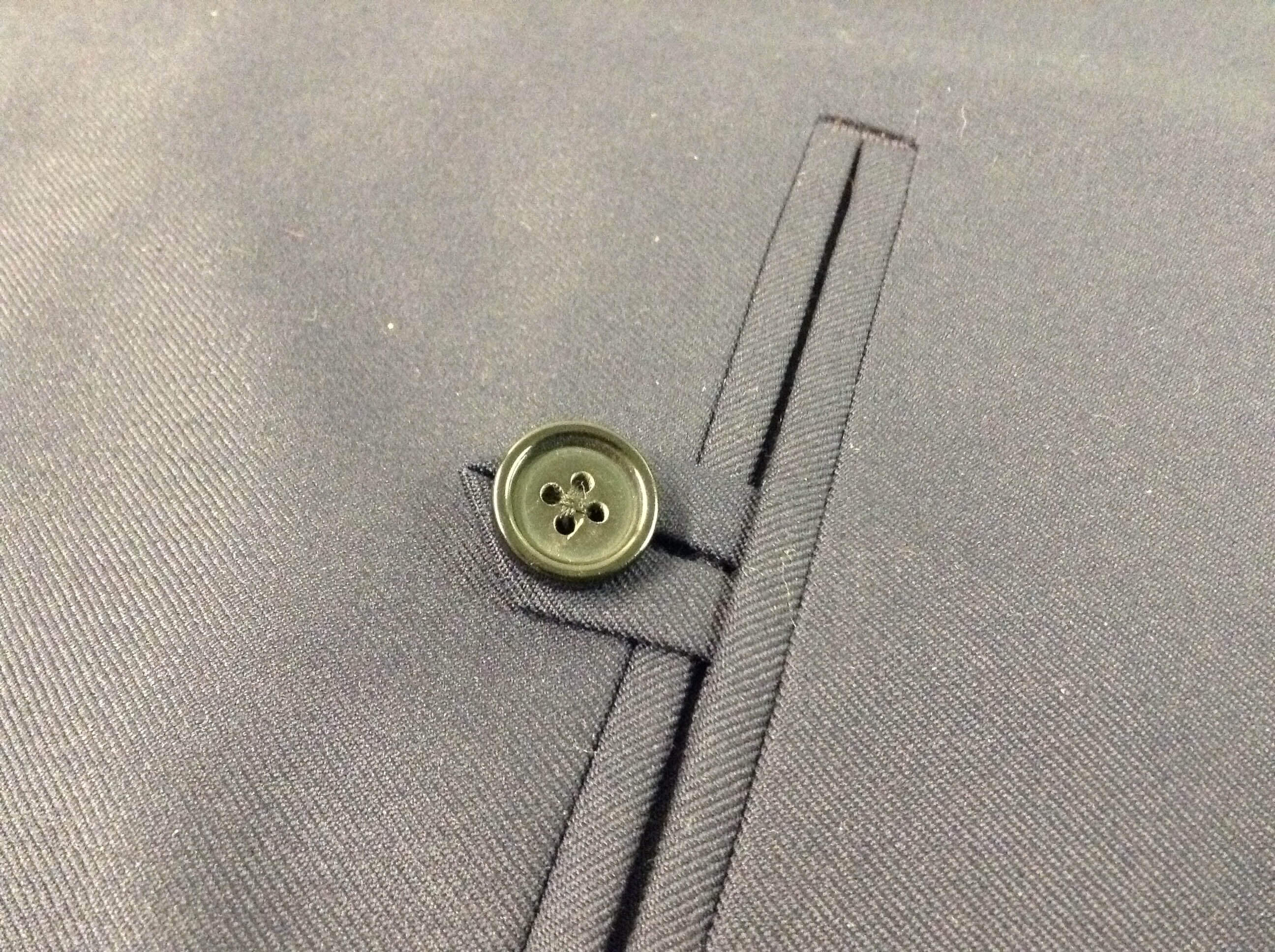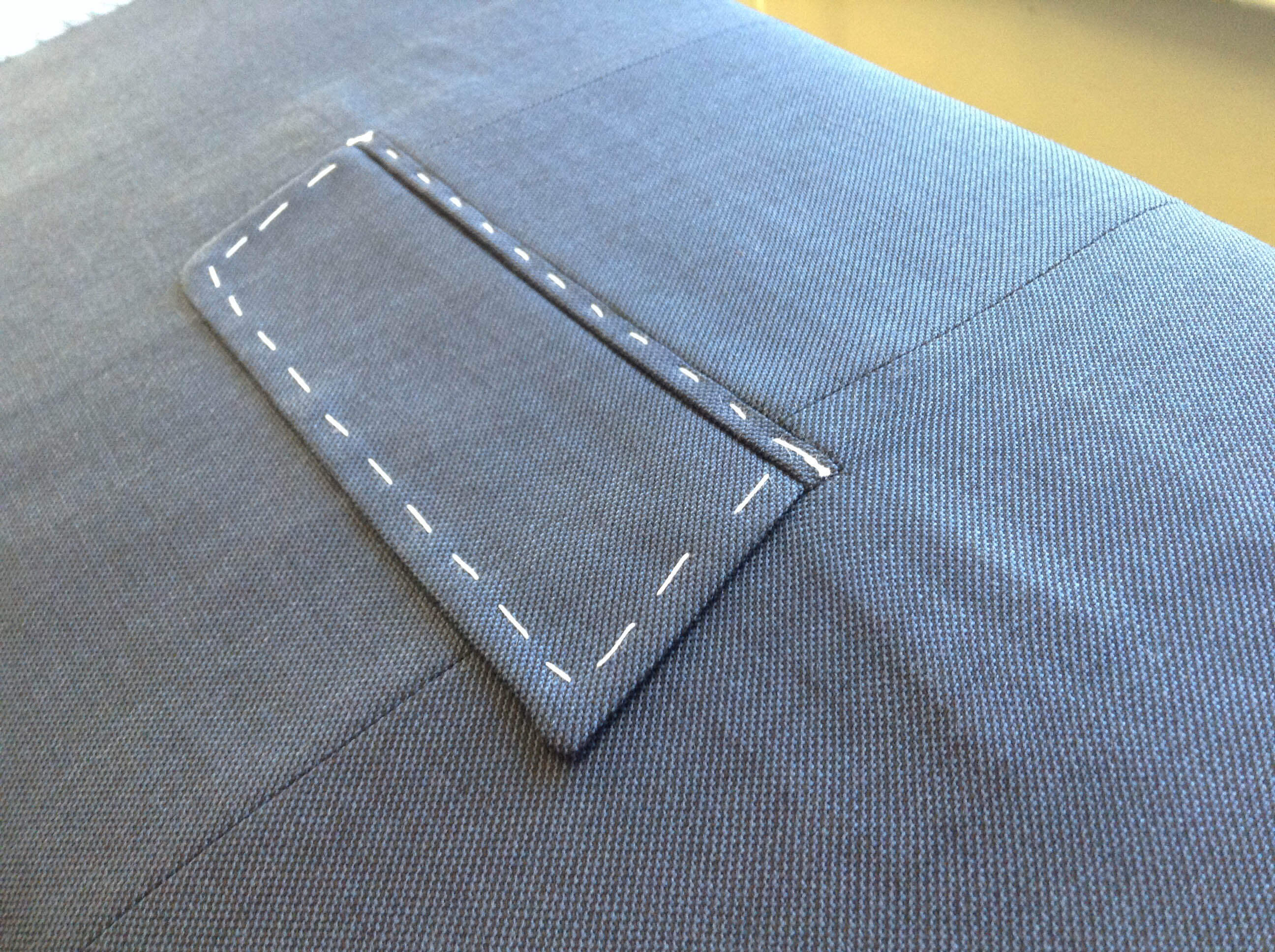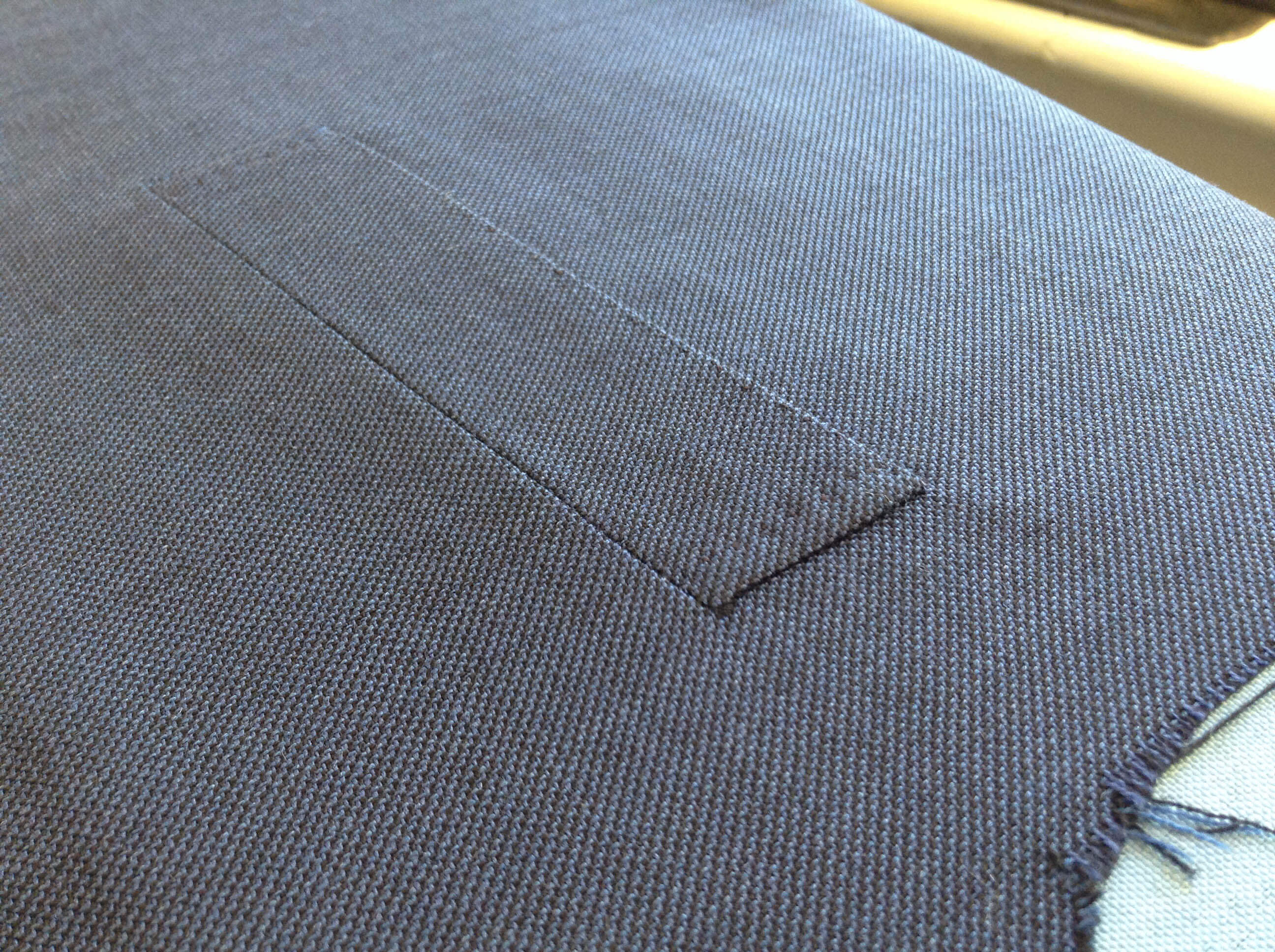 Hand made breast welt pocket. Can you see the delicate hand stitching along the top edge and down the sides ?