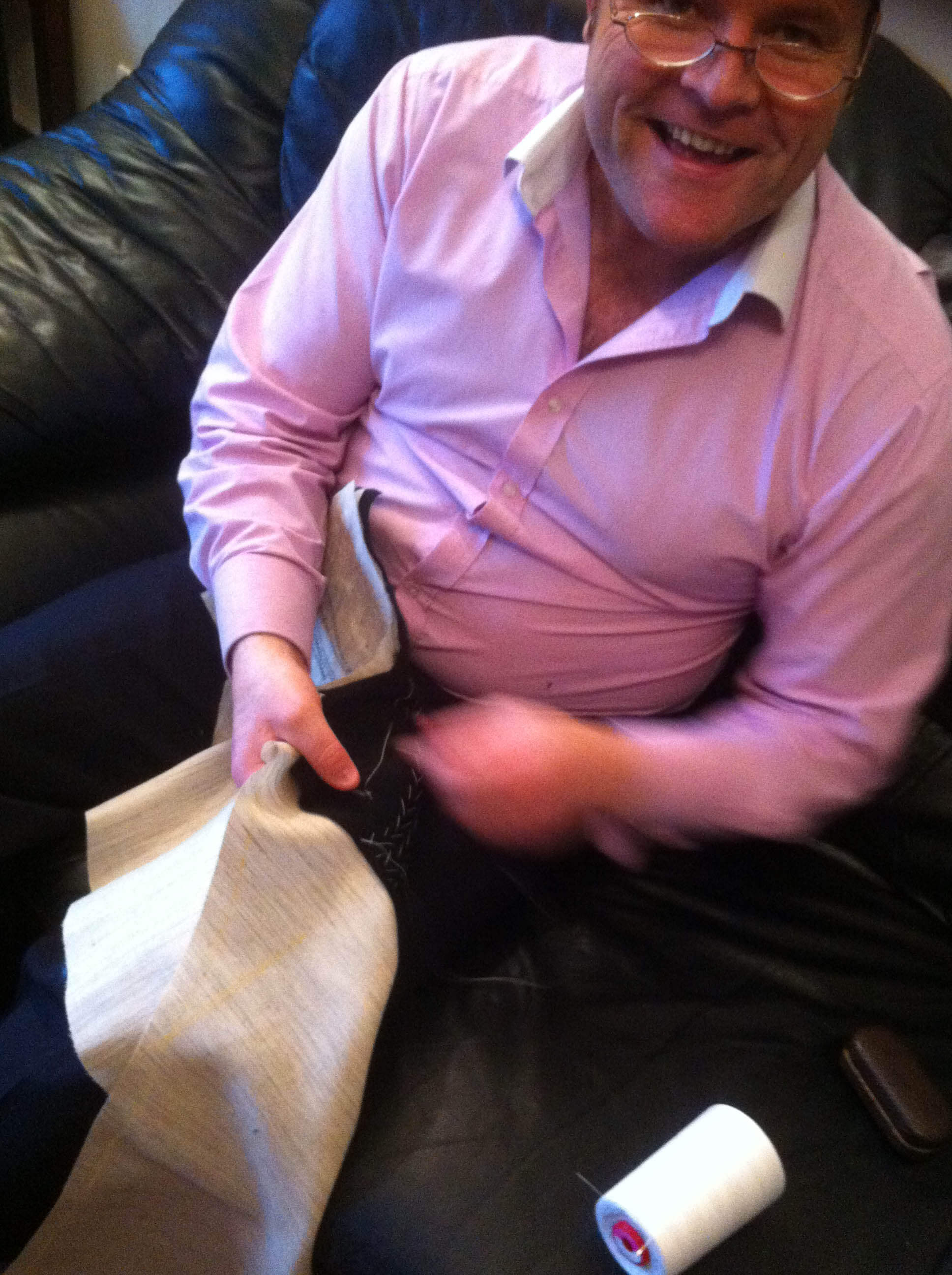 The picture below shows Desmond Merrion hand padding (making) a chest canvas for one of my bespoke coats. This picture was taken of me at home on my sofa after work, on the fly by Sarah. Thanks Sarah…..