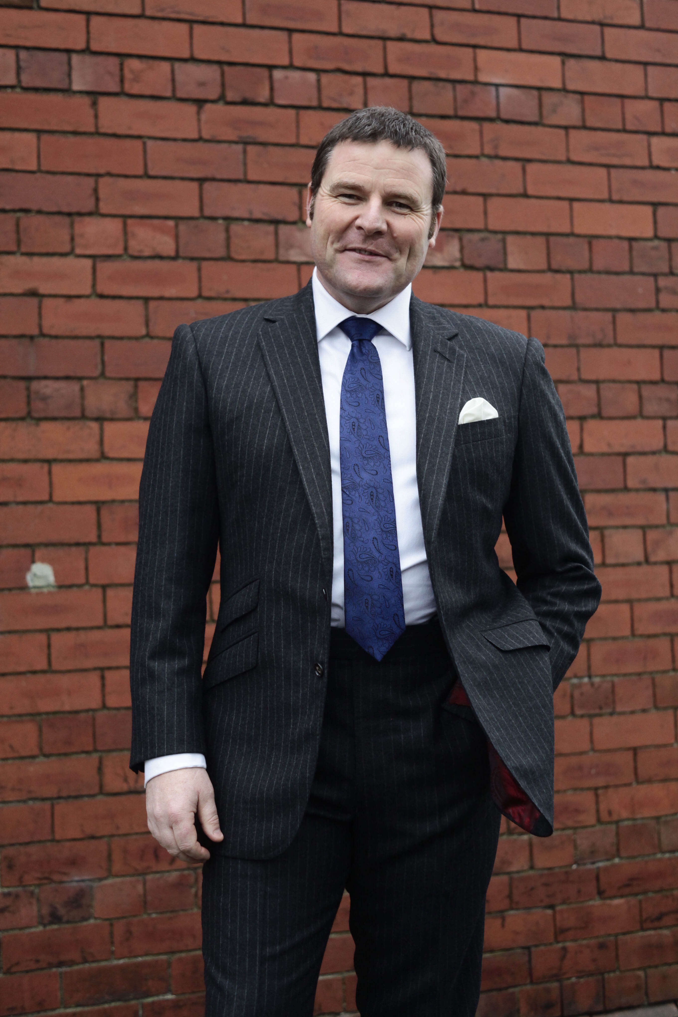 The reason I love this suit and this particular striped grey suit so much is because of its easy ability to mask a lot of my bulk. I am around 5’9″ but I dress out at around 16st 10lbs, so I am no shrinking violet. I was talking to a friend when the pictures were taken so my mouth seems a bit odd, but then again it could just be my mouth, I am after all an ugly bugger.