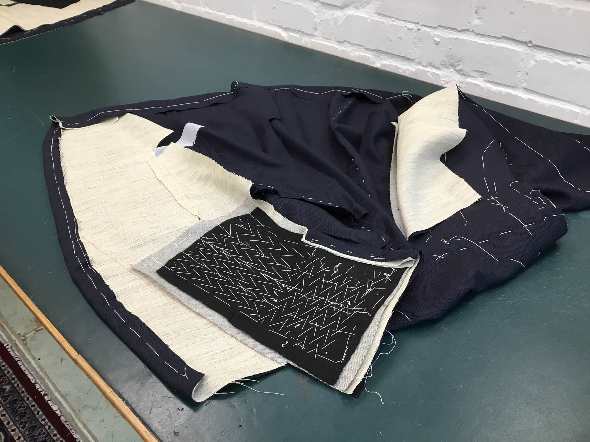 The picture below shows the inside of a bespoke coat I’m working on at the skeleton baste fitting stage. You can clearly see the hand made full canvas inserted throughout the coat fronts, this canvas extends from the shoulder all the way down to the hem. Check underneath this canvas to make sure the front of the coat hasn’t been ‘skinned’ with a fusing.