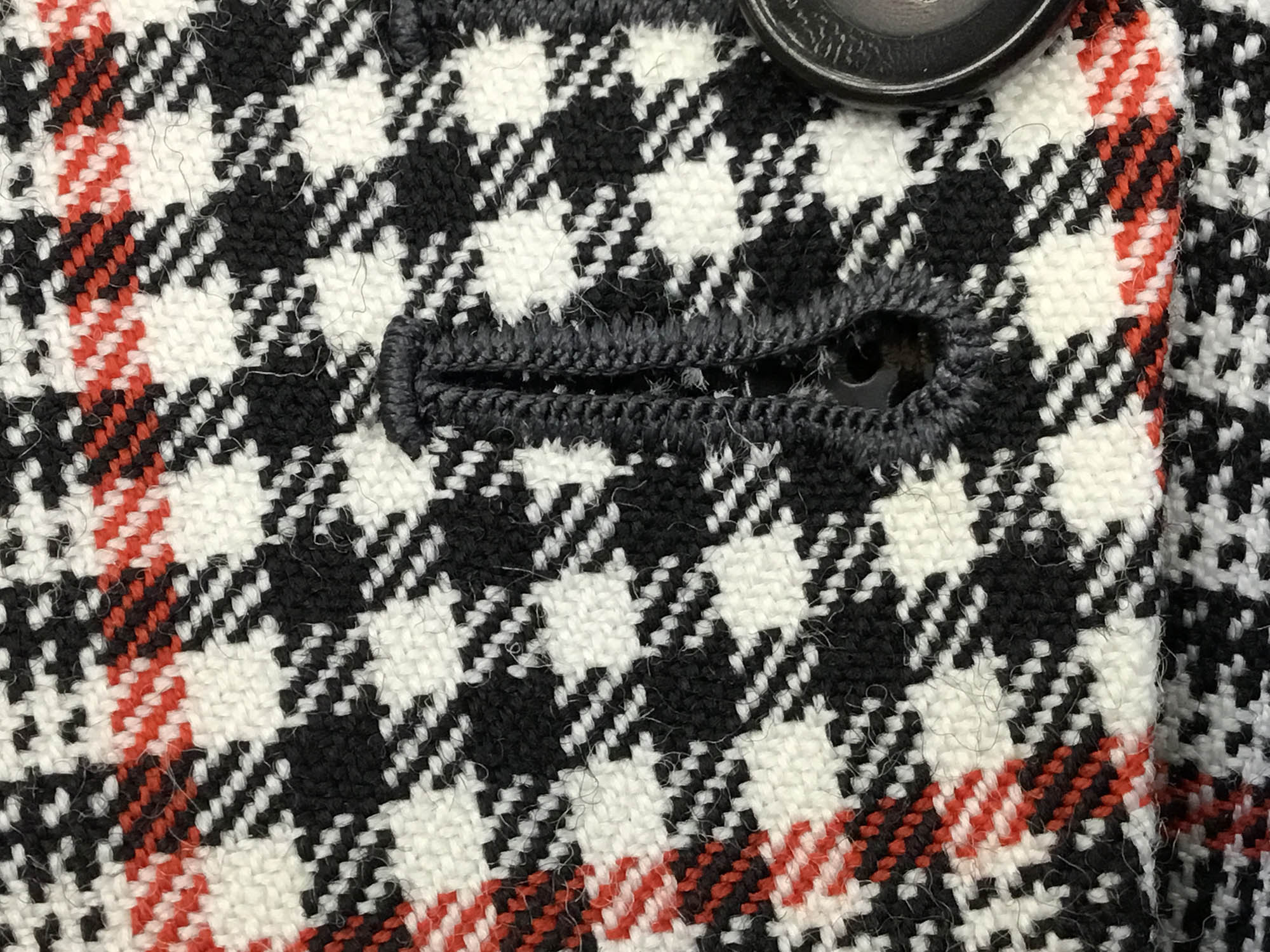 9 ) Button Holes. Bespoke suits have hand made button holes, never, ever machine made. And have a gimp inner to make them stand higher and give them strength. The reverse side of a hand made button hole is vey irregular in appearance. A factory made coat will have machine made button holes, this button hole is totally consistent on the reverse side. The picture below shows the back of a machine made button hole.