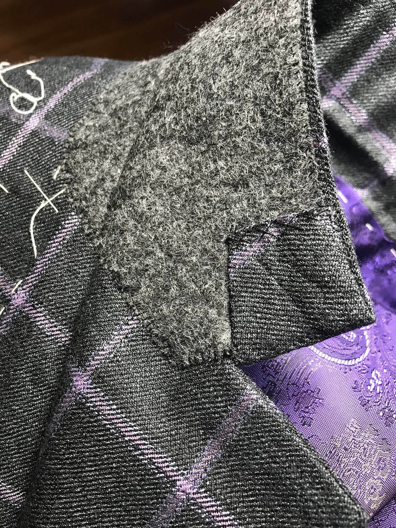 7 ) Coat Edges. A factory made suit will have quite pronounced edge stitching, lift the collar or front lapels up to see underneath and you’re sure to see the nice consistent machine stitching.