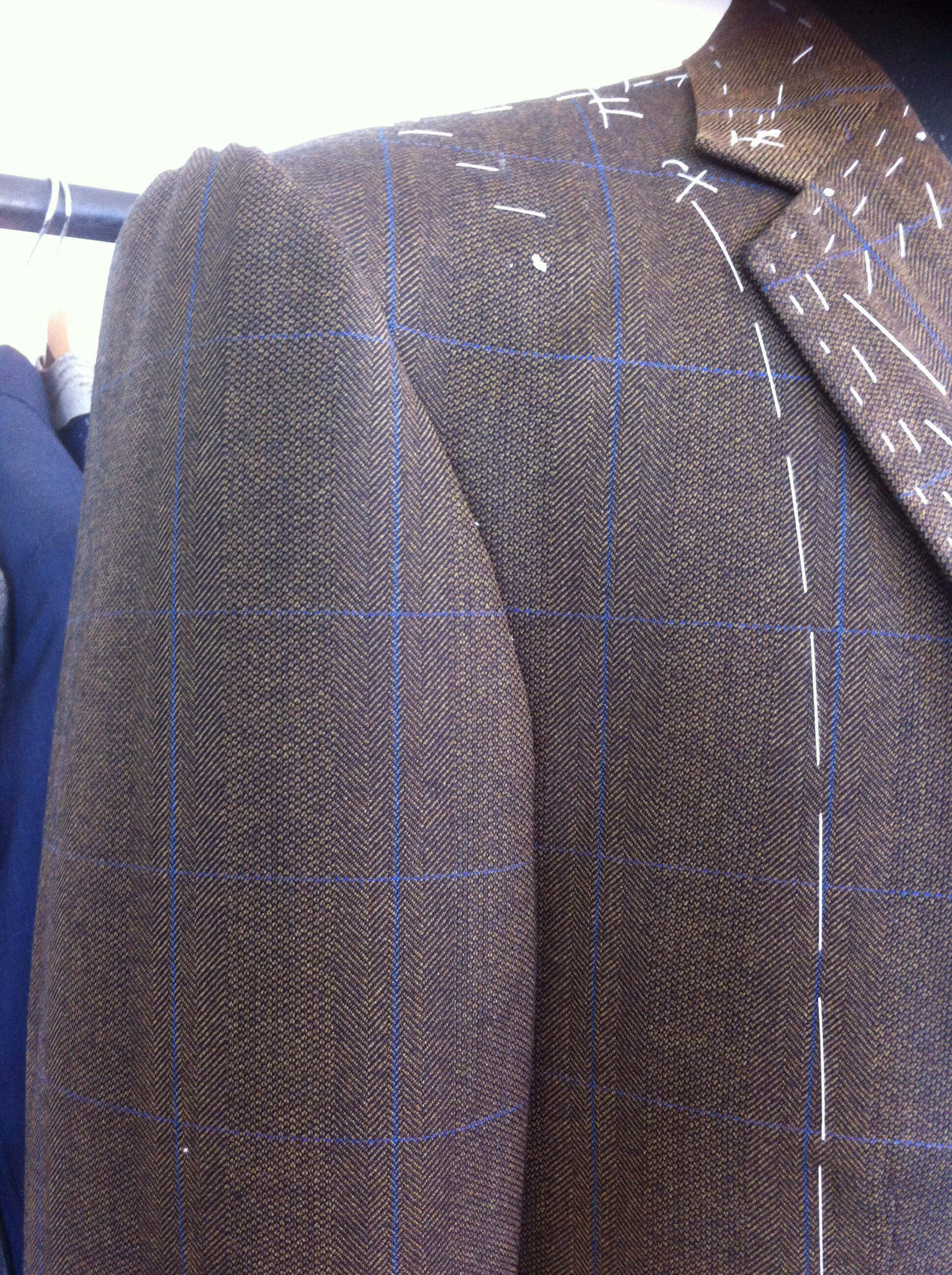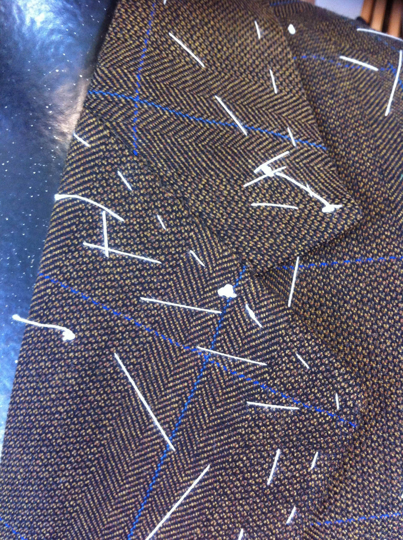 The next picture below shows the right sleeve hand basted in place waiting to be fixed in place. The pattern matching has again been maintained both ways on the sleeve for my client. Cutting sleeves to match both ways is rarely, if at all, attempted by the ready to wear market and most ‘tailors’ will simply match the horizontal lines if you are lucky.