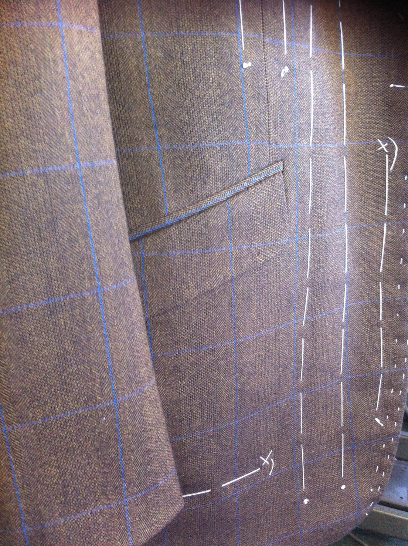 The next picture below shows a section of the right hand side of the coat front. You can clearly see the precise pattern matching that I have ensured I maintained with the pocket flap matching vertically and horizontally. I also really like the electric blue over check that runs over this cloth, so I decided to also carry the blue through the pocket jettings. These are the actual thin piping strips that for the actual mouth of the pocket. Apologies that the picture below is slightly out of focus, I take all my pictures with my iPhone whilst at work. They are not staged, they are simply taken ‘as is’ documenting my daily workings as a cut and make tailor.