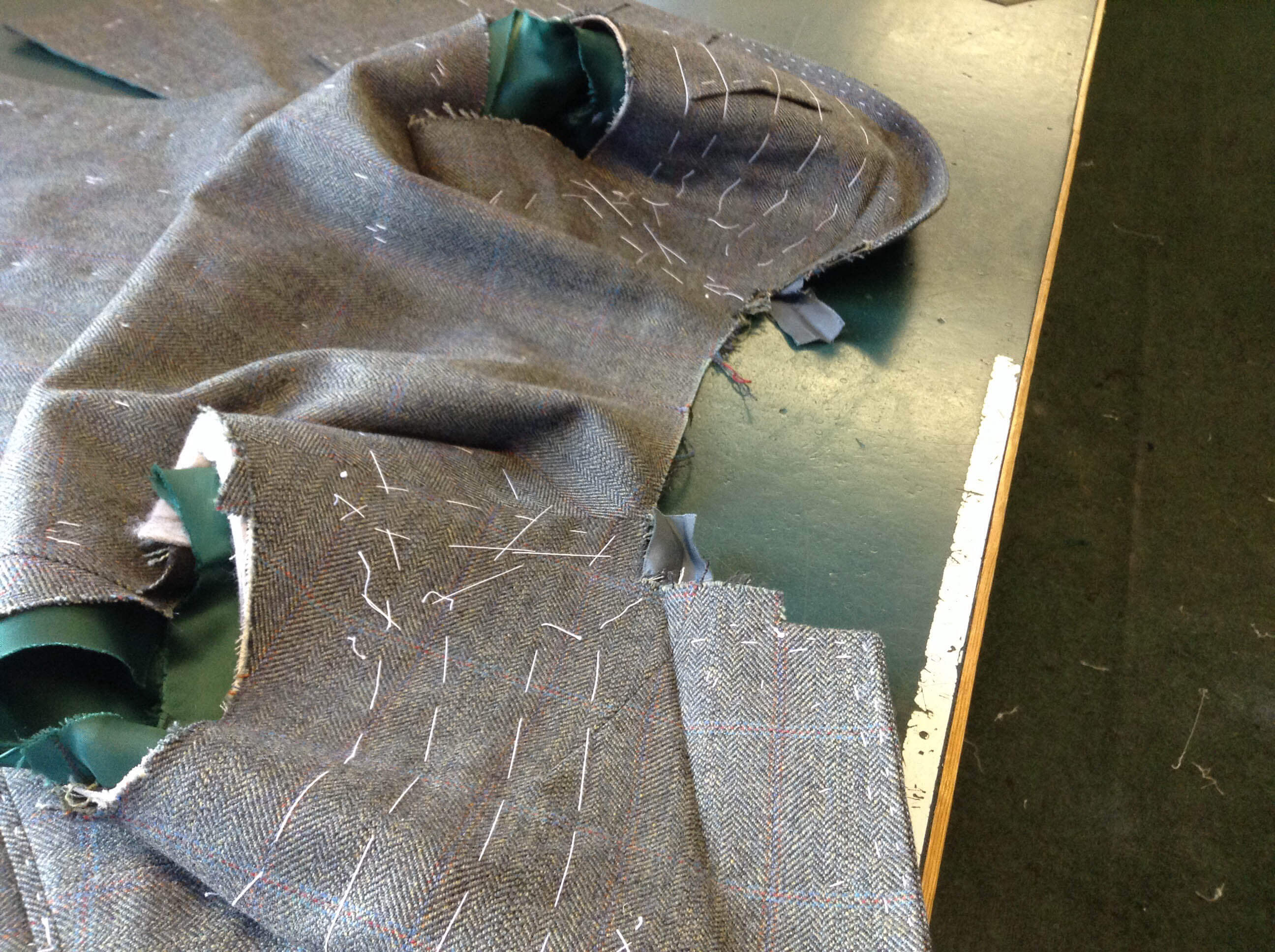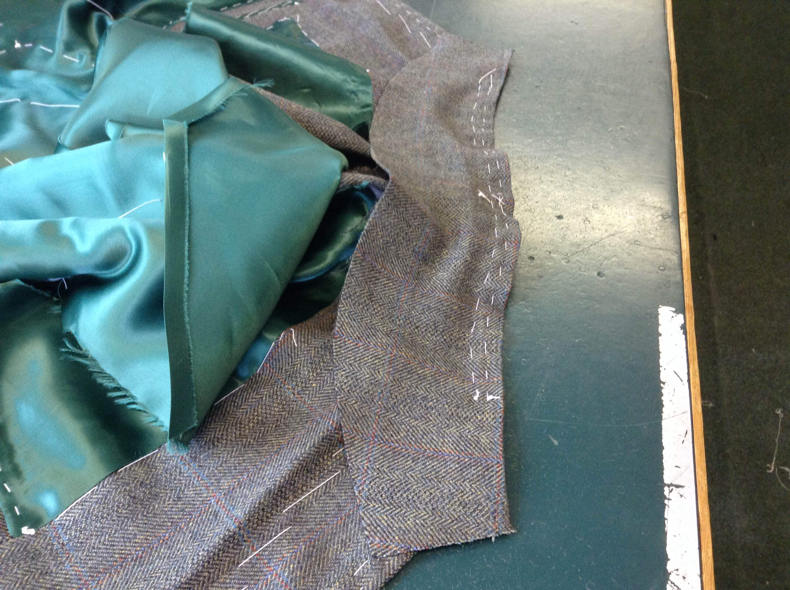This next picture shows The top collar pressed over in place. The collar is now waiting to be hand drawn together at the lapel and collar seam. You can clearly see the hand made lapel hole that I have also done in green silk.