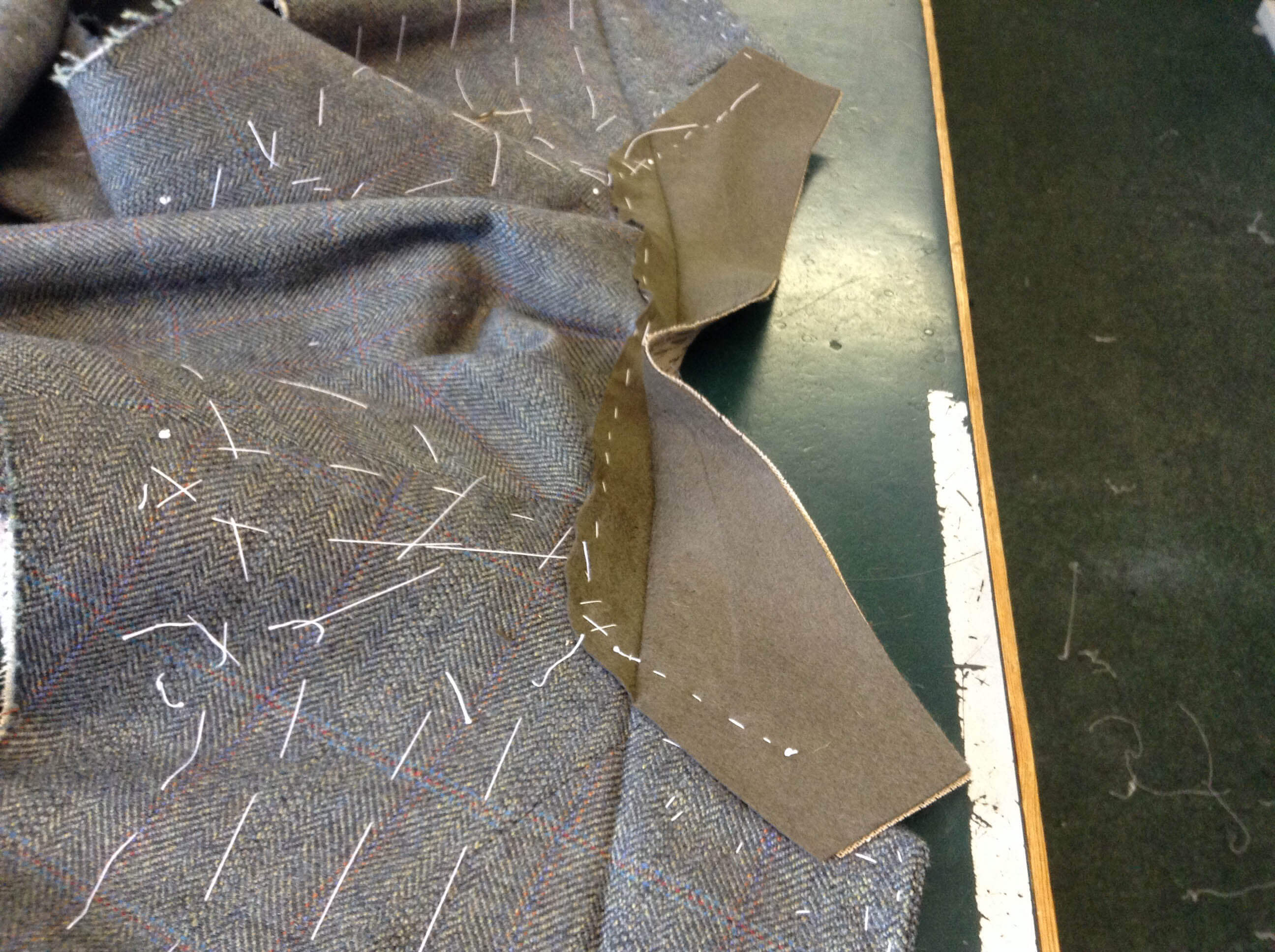The next picture shows the roughed out melton under collar basted onto the coat neck. You can see in this picture the melton extends almost to the end of the lapel tip.