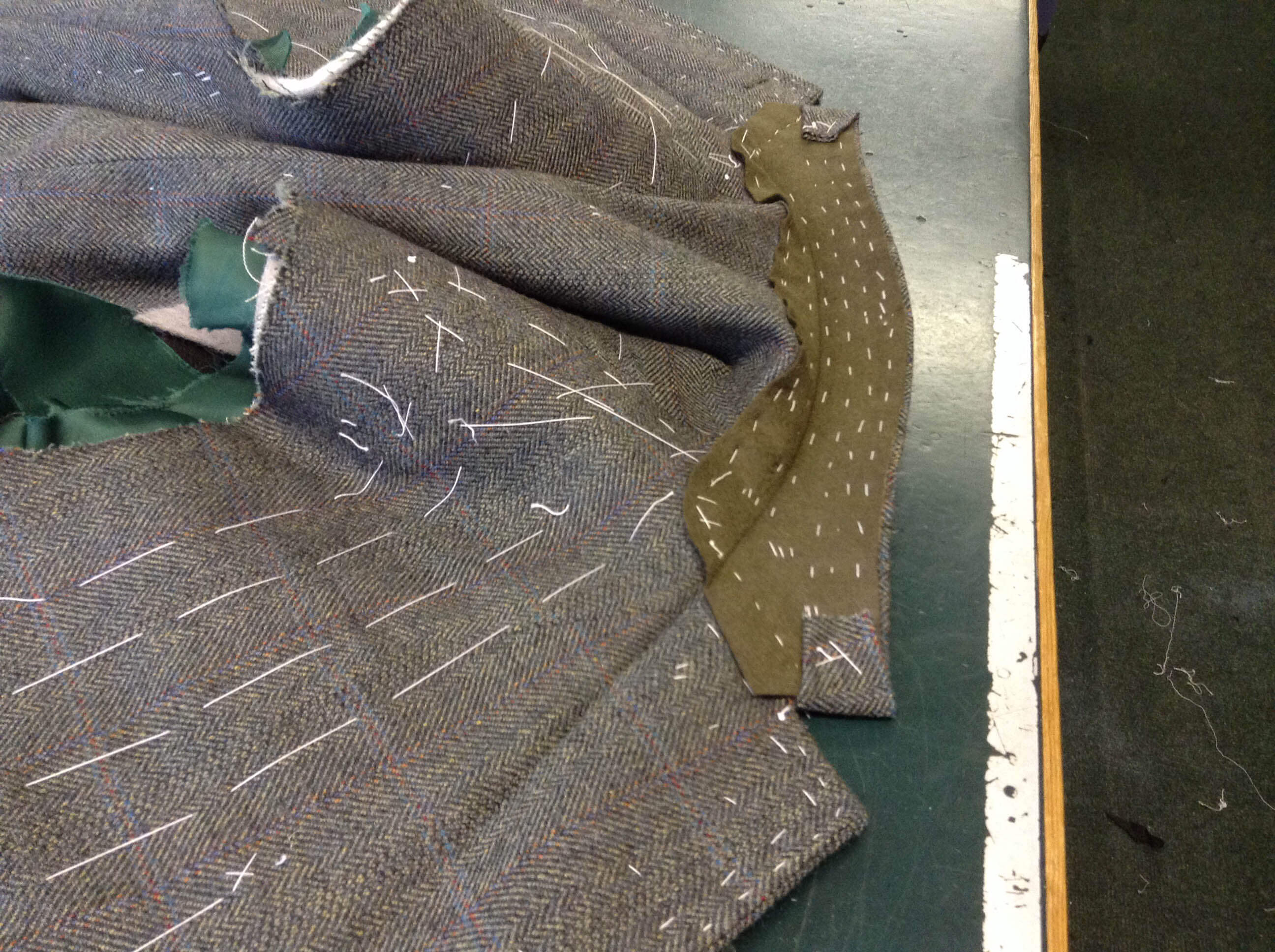 This shows the collar pressed in place and the gorge seam waiting to be hand sewn together. You can also see the hand made lapel hole I have worked.